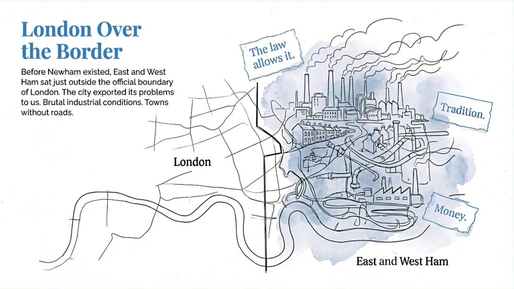 Before “Newham”, there was East Ham and West Ham, just outside the official boundary of London. Which wasn’t a good place to be. The city at the time was exporting its problems to “London over the border” – that was us, right here. There were brutal, dangerous work conditions in the new industries, towns built without proper roads, the south of the borough regularly flooded by a poisonously polluted Thames.
