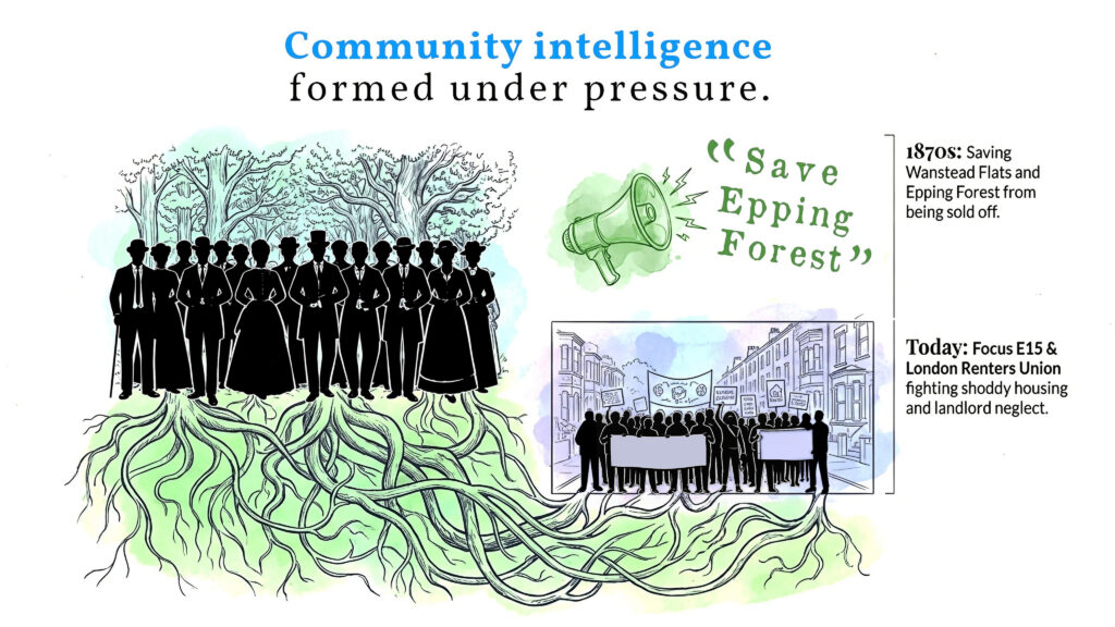 So community intelligence in Newham evolved under extreme pressure — and it became seriously sophisticated. Co-ops, volunteer groups, trade unions, mutual aid networks — these were just some of the building blocks.