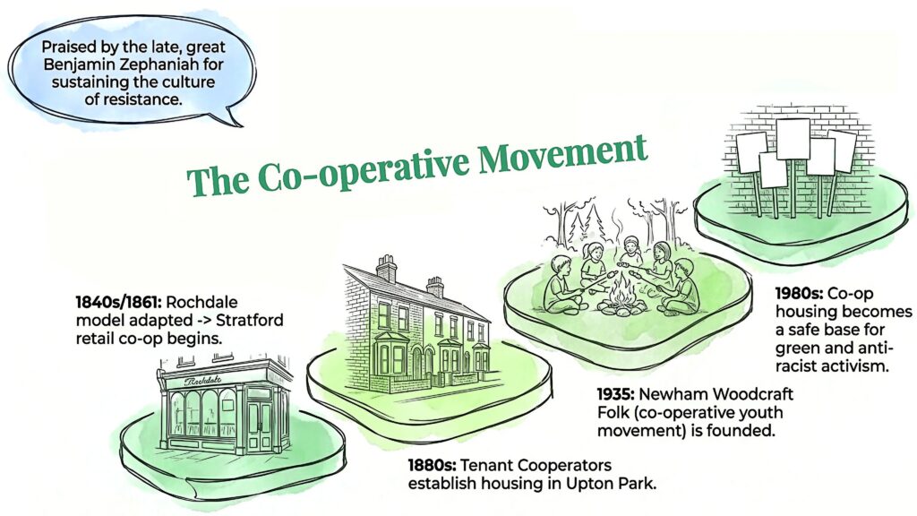 Co-ops are built for community persistence, but they can also support resistance. Newham’s co-operative housing and culture in the 1980s was a safe base for anti-racist and green activism: the late, great Benjamin Zephaniah went out of his way to praise it.